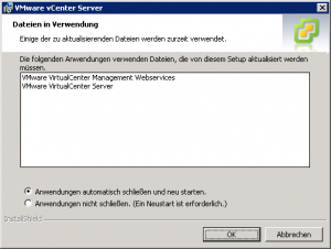 Solltet Ihr nun mit der Installation fortfahren wollen, achtet darauf das keine weiteren Komponenten das vCenter aktiv verwenden. (Backup Exec etc.)