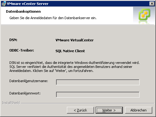 Abbildung 3: Wenn Ihr nun die originale Datenbank-Engine verwendet empfehle ich das beibehalten der vCenter-Daten…