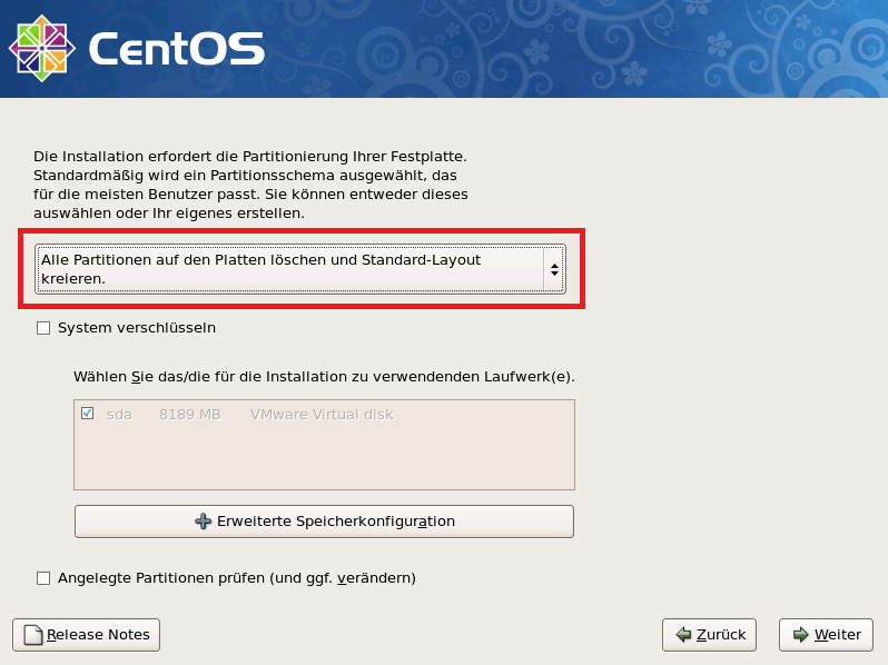 Bei der einfachen VMware-Installation kann man das erkannte nix existierende Format auch gleich durch den Standard ersetzen lassen.