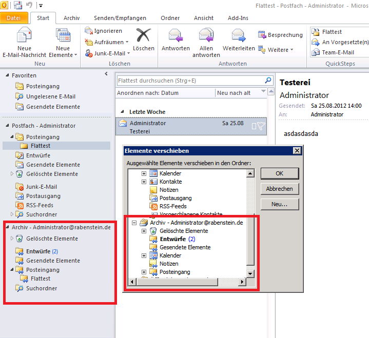 Unglaublich aber wahr, nicht nur in der OWA können Elemente verschoben werden – „Kontext/Verschieben nach“ und klicken wo es hingehen soll.