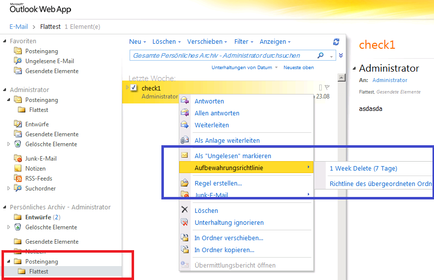 die Einrichtung für Aufbewahrungsrichtlinien auf dem Exchange-Server ist natürlich nur die eine Seite der Steuerung für die Archivierung. In etwa wie folgt lässt sich aber auch per OWA (Outlook Web Access) damit arbeiten.