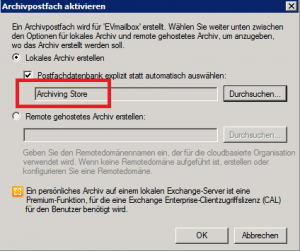 Da Exchange auch in der Lage ist Archive im eigentlichen Postfachspeicher abzulegen – was im sinne einer Auslagerung durch Speichermangel ehr ungünstig wäre, sollte man beherzt die Archiv-Datenbank angeben.