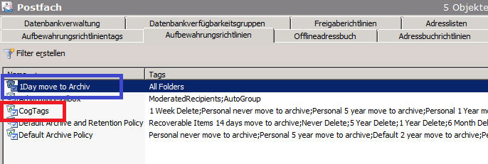 Nicht vergessen, die Richtlinien wirken durch die Tags auch unterschiedlich. Also rot oder blau oder gemischt, wobei gemischt durch die „Default Archive Policy“ dargestellt wird. (wenn der Benutzer seine Nachrichten nicht tagt werden sie wie der Ordner behandelt – also blaue Variante)