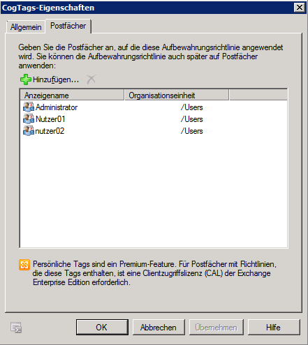Falls später weitere Benutzer/Mailboxen auf dem Exchange angelegt werden, kann diesen gleich bei der Erstellung die Aufbewahrungsrichtlinie übergeben werden.