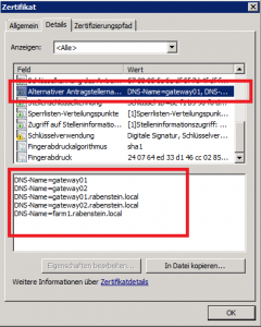 Einfach das Zertifikat anzeigen lassen und unter Details „Alternativer Antragsstellername“ die alternativen Namen anzeigen lassen.