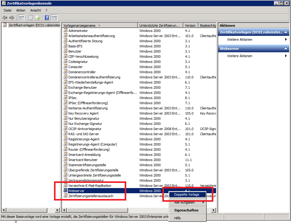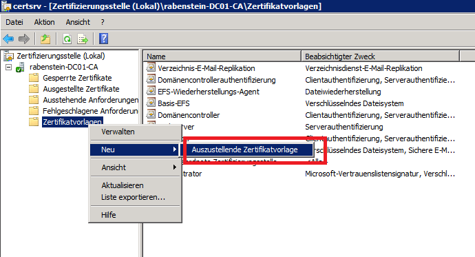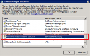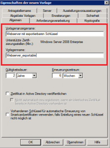 Hier nun der Beitrag wie man diese Vorlagen selbst anlegt, schon alleine weil die Vorlage Webserver das Exportieren des lokalen Schlüssels verbietet. (was es einem aber erschwert ein Zertifikat welches nicht im ISS als Anforderung erstellt wurde abzuschließen)