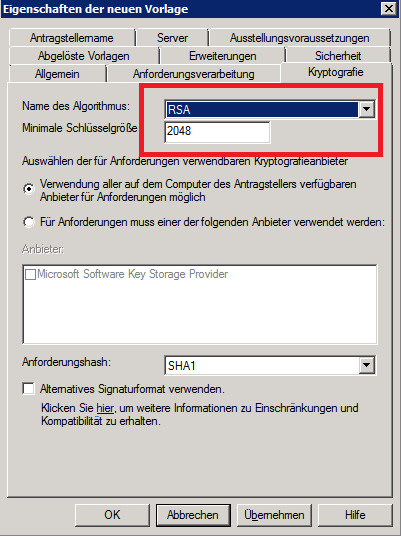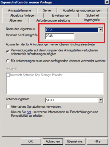 Hier findet man die Vorlage-Einstellungen für die Schlüssellänge und die Algorithmen für das Zertifikat.