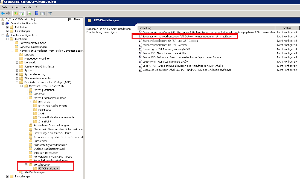 Benutzer die Bereits eine Archiv-PST angelegt haben können dann aber nicht mehr auf diese Zugreifen – gelöscht wird die PST hierdurch aber nicht.