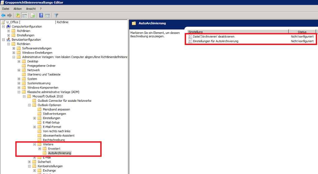 Hier kann per GPO festgelegt werden, ob die Menüpunkte für die Archivierung ausgeblendet werden sollen und wie die Archivierung vorgenommen werden soll.
