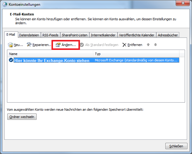 Bitte die Eigenschaften des Exchange-Kontos öffnen. („Ändern“)
