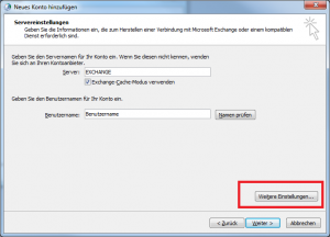 Bitte geben Sie als Server der lokalen DNS-Namen des Exchange-Servers an.