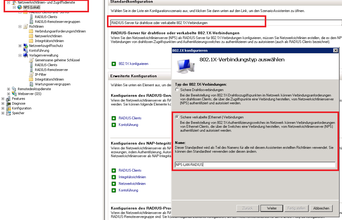 2. Konfiguration des RADIUS bzw. NPS für kabelgebundene Verbindungen