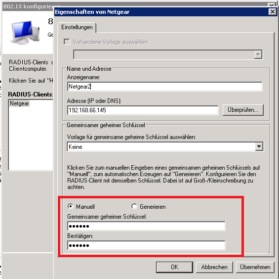 Als Nächstes werden nun die Verbindungseinstellungen für die Dritthersteller-Geräte festgelegt die auf den RADIUS- /NPS-Server zugreifen sollen.