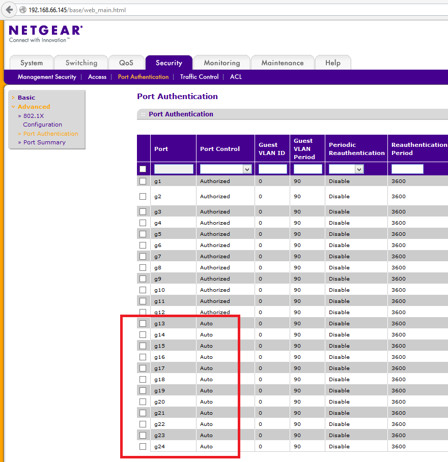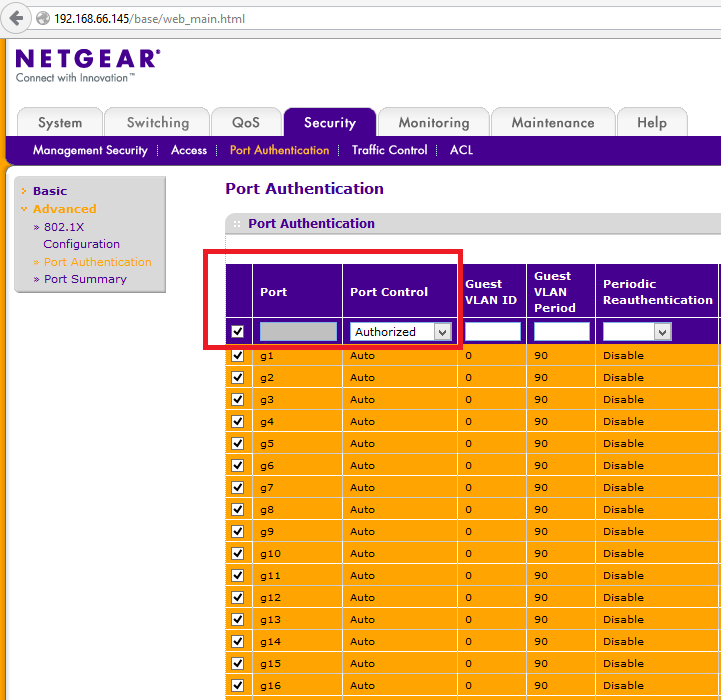 Bevor die Zugriffsart der Switch-Schnittstellen eingeschränkt wird, sollte man sich immer eine Türe offen halten. Daher bitte schon Mal in den Bereich Sicherheit gehen und dort die „Port Authentication“/Advanced Port Authentication“ besuchen. Siehe Abbildung 1: