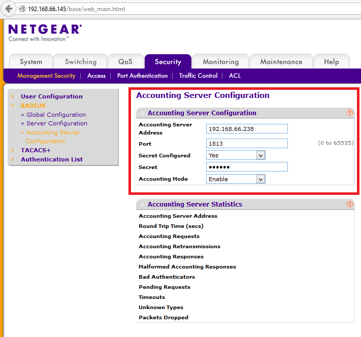 Bitte zum Reiter „Management Security“ springen und dort die „RADIUS/Server Configuration“ öffnen. Hier wird nun für der NPS-/RADIUS-Server konfiguriert – siehe Abbildung 4: