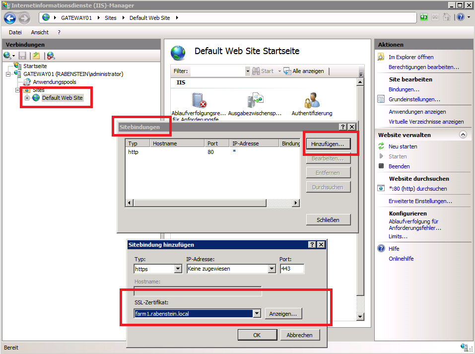 nun könnt Ihr auf eine der „Sites“ welchseln und dort das Zertifikat in einer der Bindungen hinterlegen. (eine Bindung gibt an auf welchem Port und unter welchem Hostheader eine Website erreichbar seien soll) Folgt einfach der Abbildung 3.