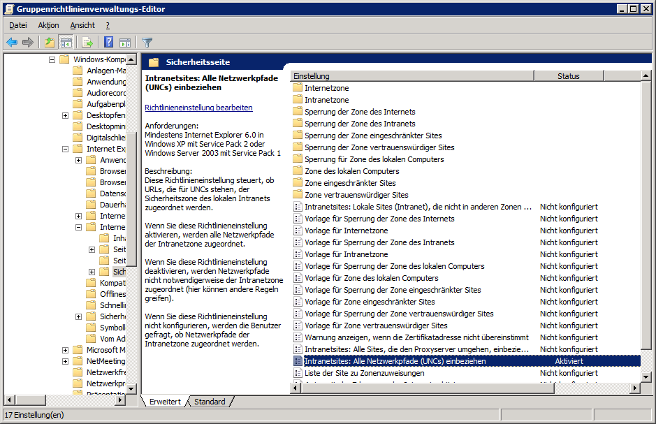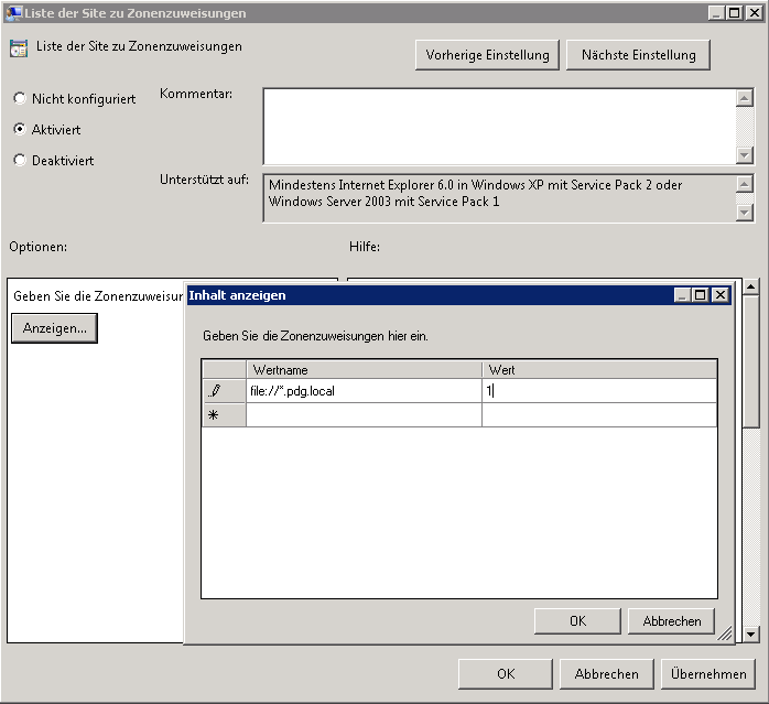 Hier sollte der Pfad: „file://*.<Domäne>“ via Wert 1 dem Intranet zugewiesen werden.