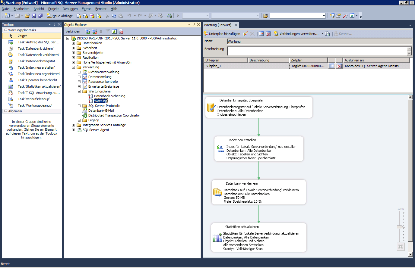Hier eine Zusammenfassung unseres Wartungsplans für die Sharepoint-SQL-Instanz, siehe Abbildung 1.