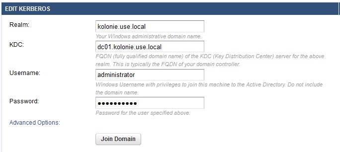 • unter „Users/Groups“, „Authentication“ kann die Kerberosintegration konfiguriert werden, dafür geben die Domain, den Server und ein Konto mit administrativen Berechtigungen ein (siehe Bild)