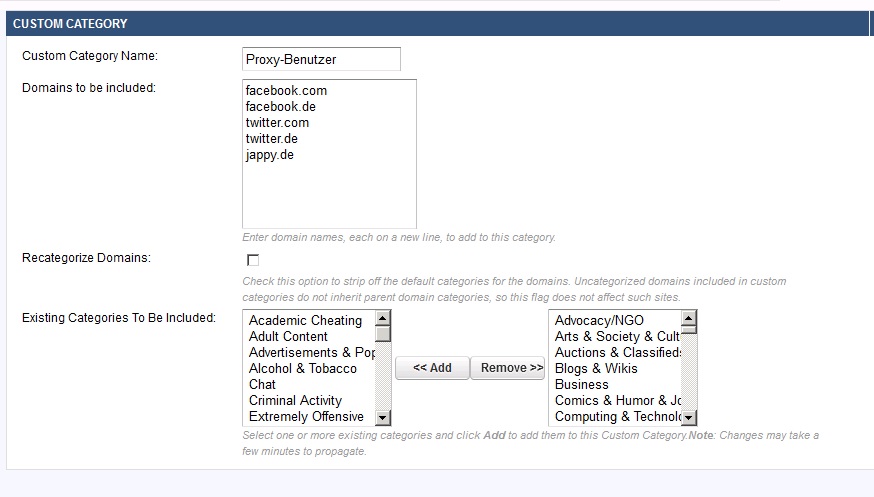 Für die angelegten AD-Gruppen können nun unter „Block/Accecpt“ – „Custom Categories“ entsprechende Filter und Aktionen konfiguriert werden.