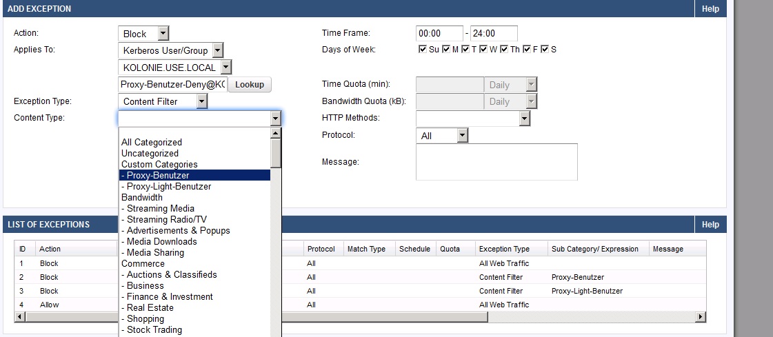 Als Ausnahmetyp wird dann der Content Filter und unsere vorher angelegte „Custom Categorie“ ausgewählt.