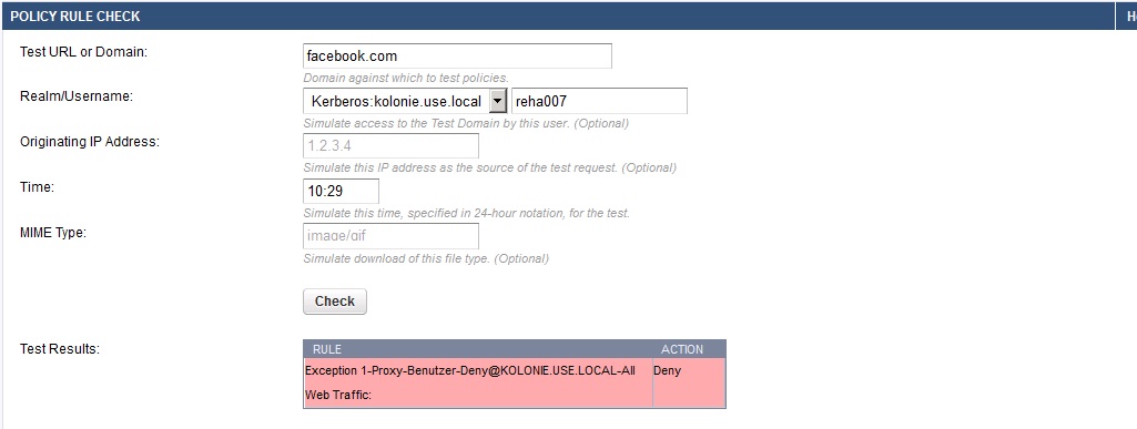 Dort kann eine URL und ein Benutzername eingegeben werden und als Ausgabe wird die entsprechende Filter Regel die greift mit der Aktion Deny/Allow ausgegeben.