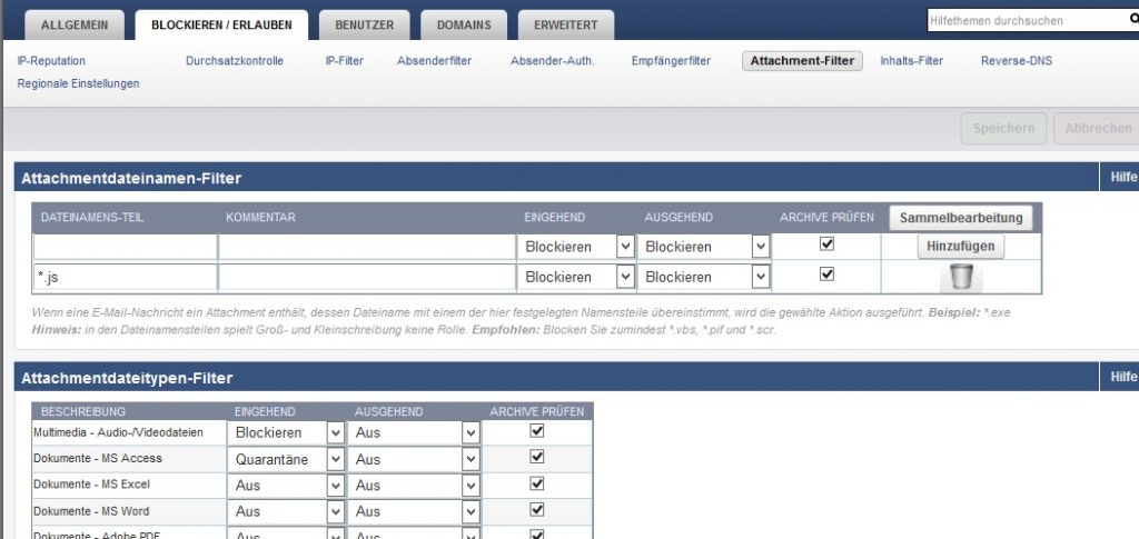 Im oberen Teil gibt es den Punkt „Attachmentdateinamen-Filter“. Dort können wir beispielsweise die Dateiendung *.js für das Blockieren von JavaSkript-Dateien ein, wählen die gewünschte Aktion „Blockieren / Quarantäne“ aus. Ebenfalls sollte dort der Hacken für „Archive prüfen“ ausgewählt sein.