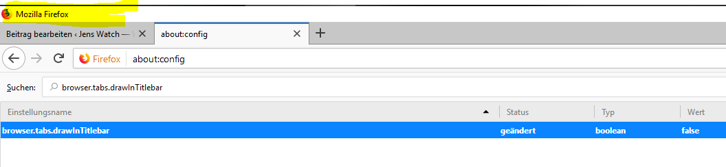 - Suche nach folgendem Eintrag: browser.tabs.drawInTitlebar