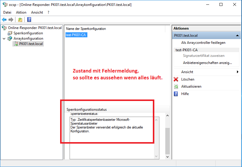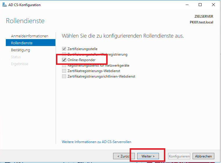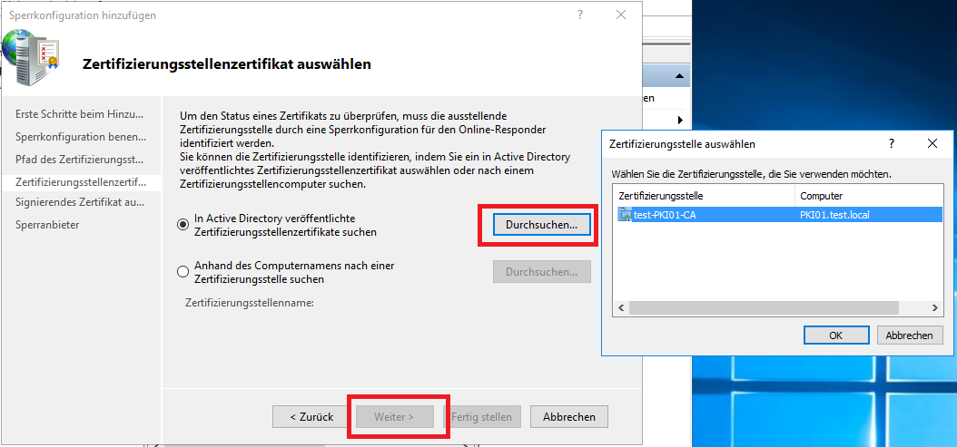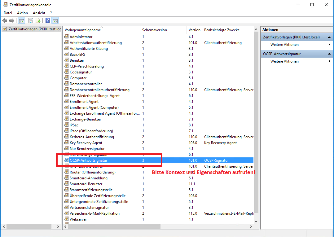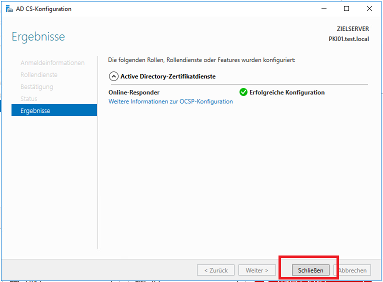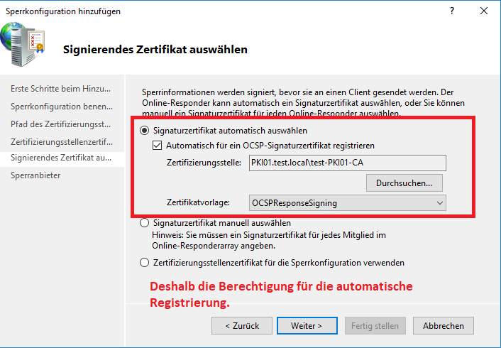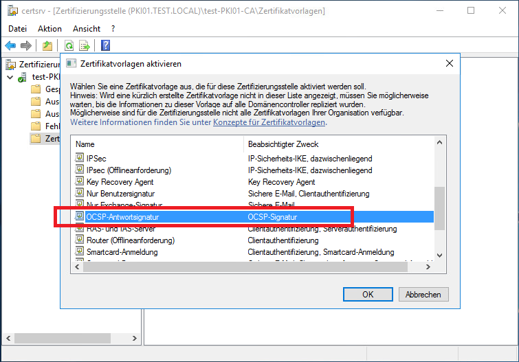 Ggf. muss später manuell ein OCSP-Zertifikat ausgestellt werden, wenn es keine Domänen-CA ist.