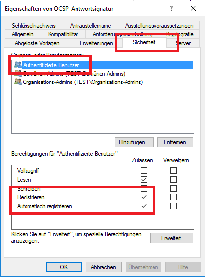 Die Sicherheitsberechtigung „Automatische Zertifikats-Registrierung“ für authentifizierte Benutzer könnte wieder abschaltet werden,