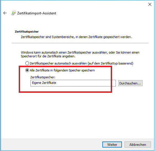 „Eigene Zertifikate“ beschreibt immer den Speicherort für normale Zertifikate,